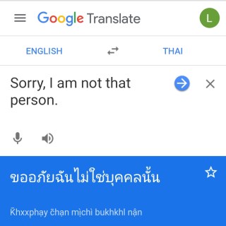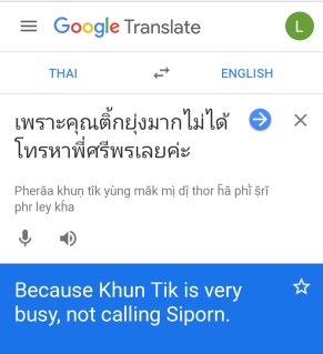 I couldn’t even read it, let alone answer it for her, because I guessed that whatever the answer was, case-sensitive Google would probably insist that it be typed in the Thai alphabet, which I could not do. I felt a bit relieved, as it meant I was finally off the hook. They’re was no way I could help her any further, and I told her so.