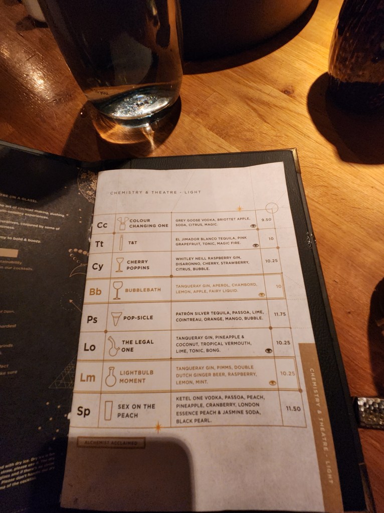 Our evening plans included a trip to the theater, so after tea, we passed the time with drinks and snacks at a super cool bar called The Alchemist. The drinks all had a very theatrical flair.