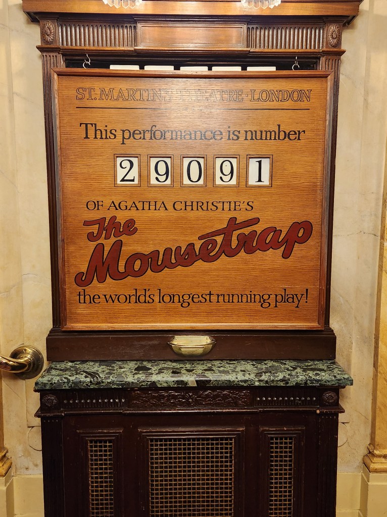 The show we saw tonight was called The Mousetrap. Written by Agatha Christie, the queen of mystery and suspense, and never performed anywhere else, the show has been playing in London since 1952 and just passed its 70th year.