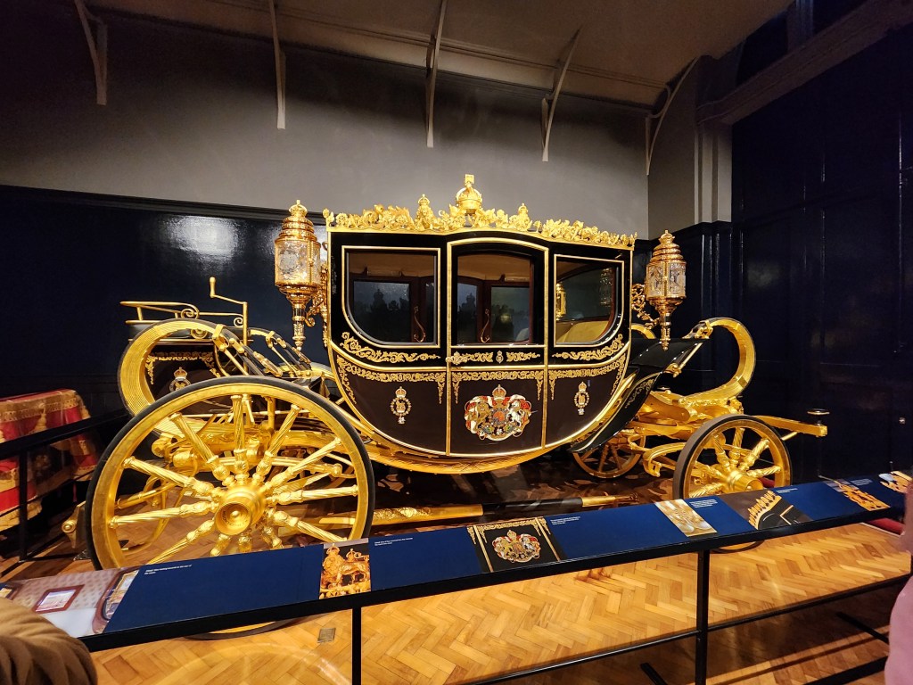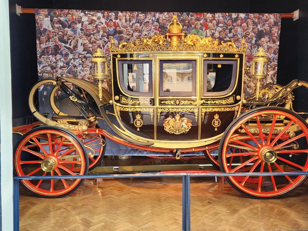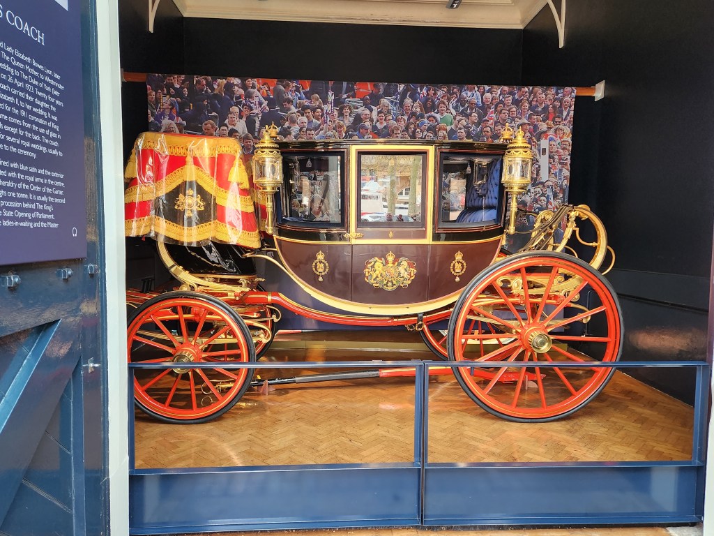 Then we got to see the royal coaches, starting with Queen Alexandra’s coach. This used to be used for actual people, but since 1962 it’s been used to transport the Imperial Crown to Parliament for its official opening every year. The crown sits on a red cushion inside. Previously, the crown was transported up the Thames on a boat.