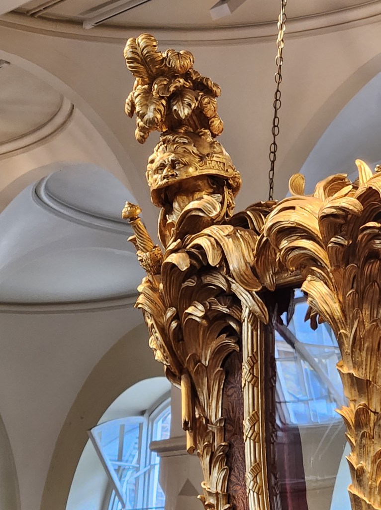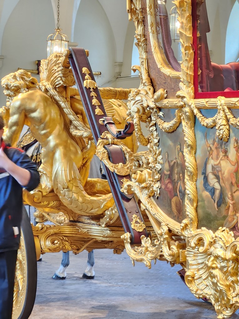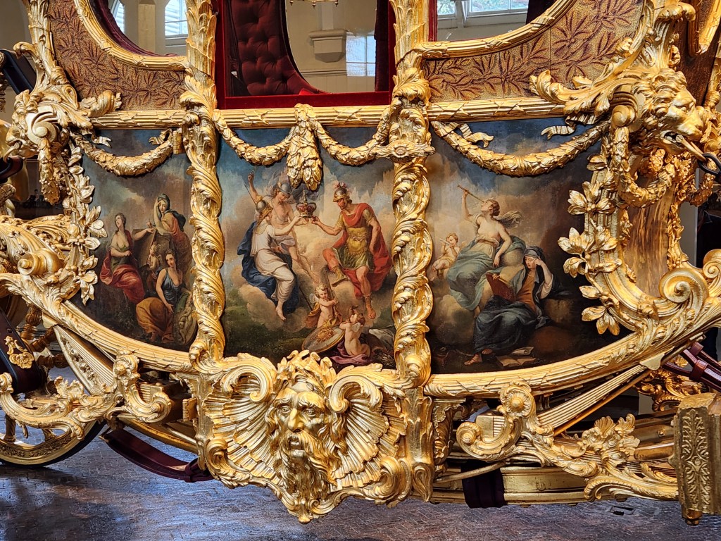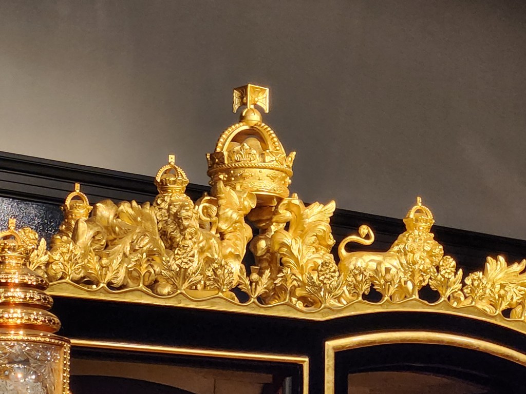 Interesting bit we learned today: one of the earlier-built carriages has ornamentation around the top to represent the three kingdoms of Great Britain: the English rose, the Scottish thistle, and the Irish clover.