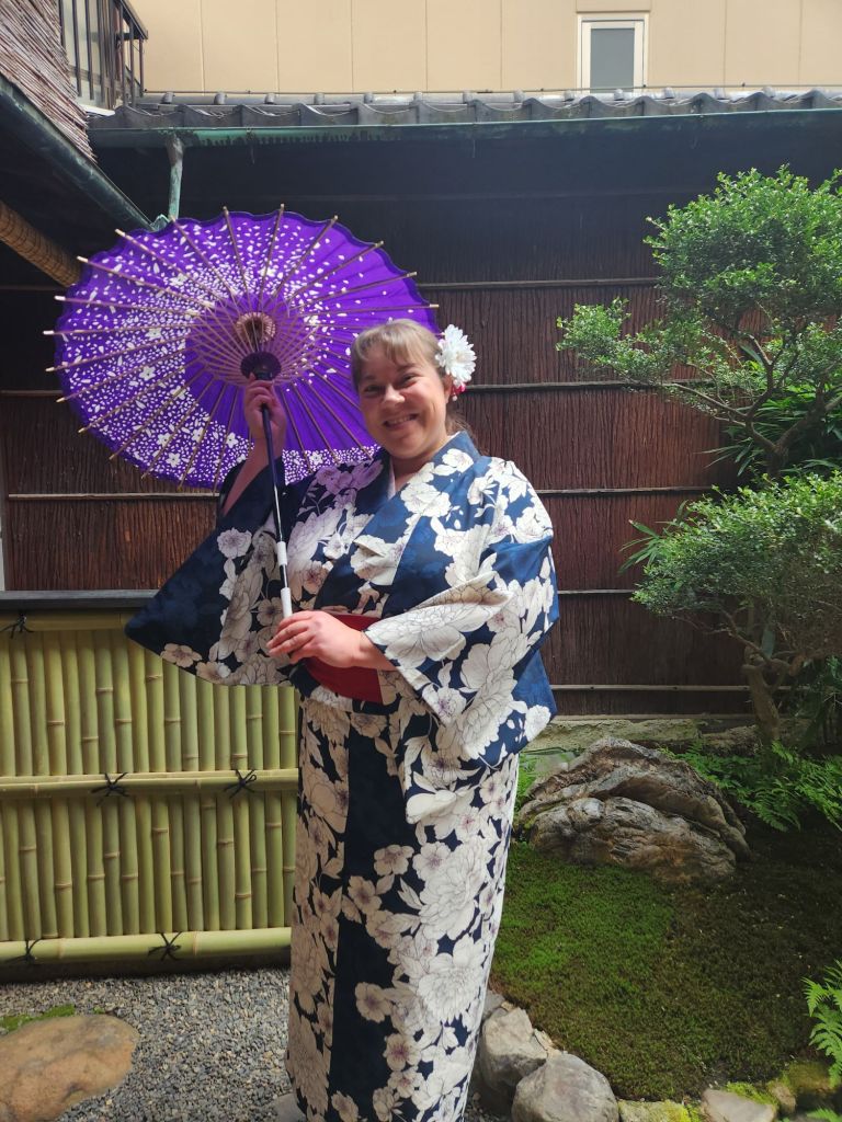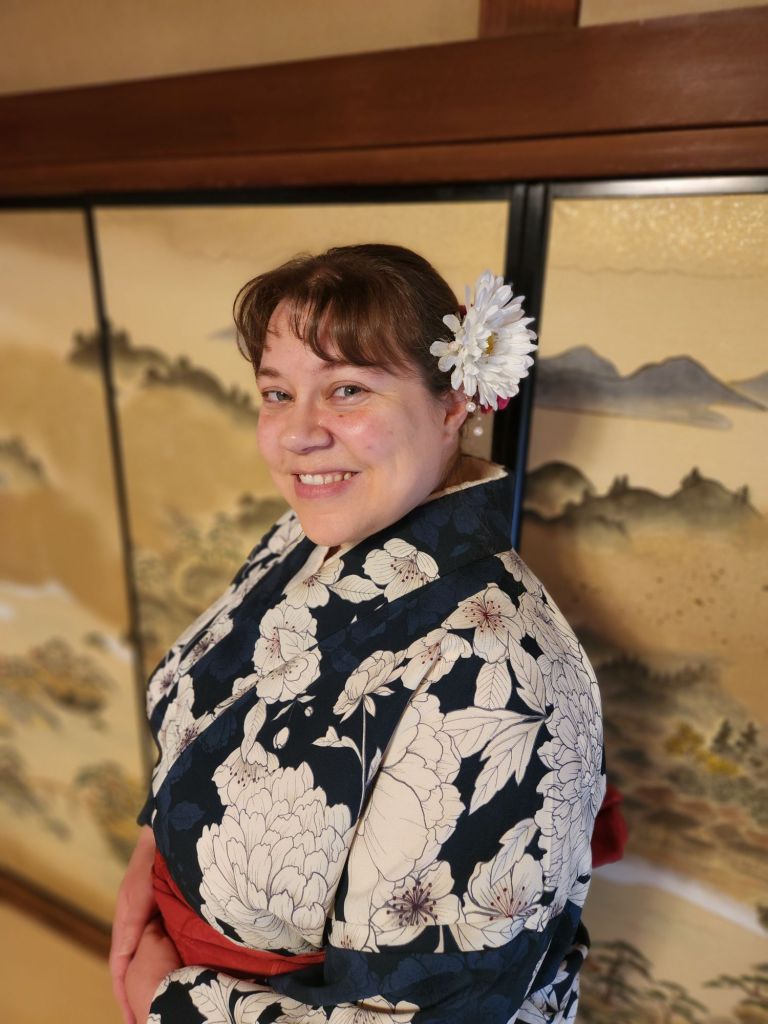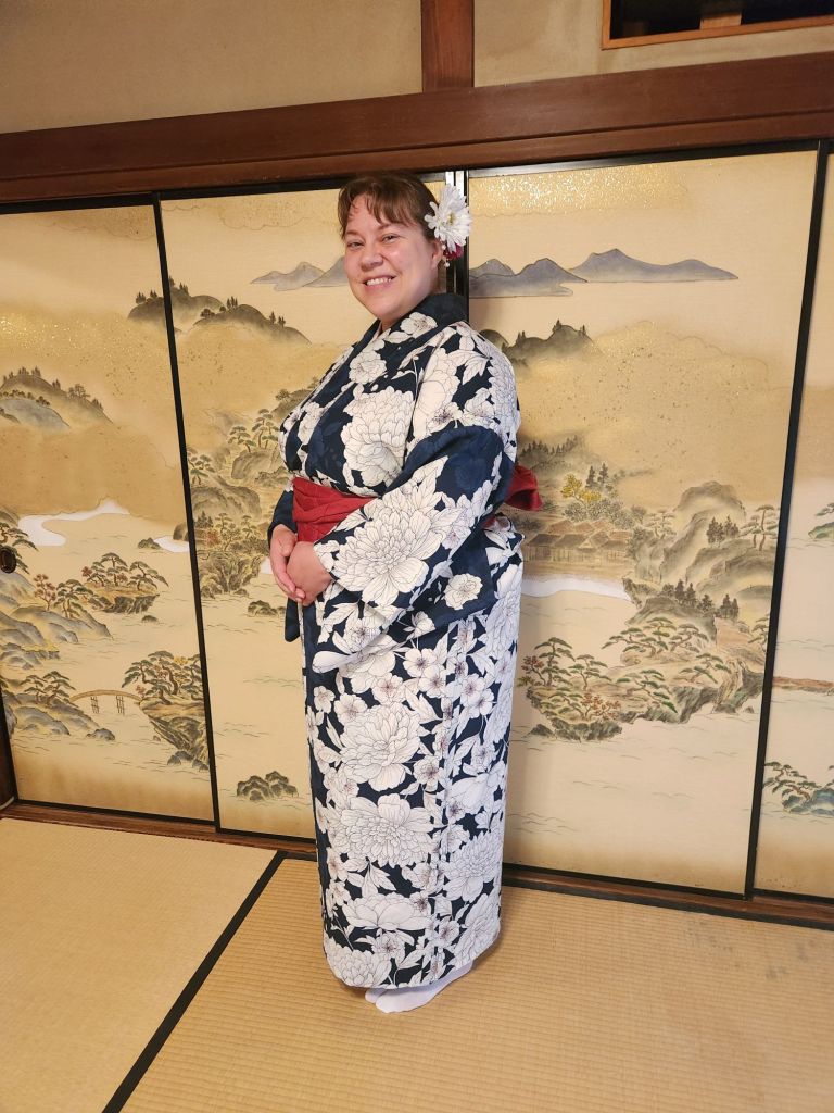 You know that montage in Mulan where her hair is getting yanked in several directions and they’re layering clothes on her and cinching them as tightly as possible? I realize that’s China and not Japan, but the process felt a lot like that. There were a lot of straps to be tied and stuff to secure things in place. Getting dressed legitimately took half an hour with two women helping.
