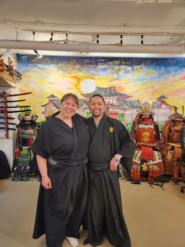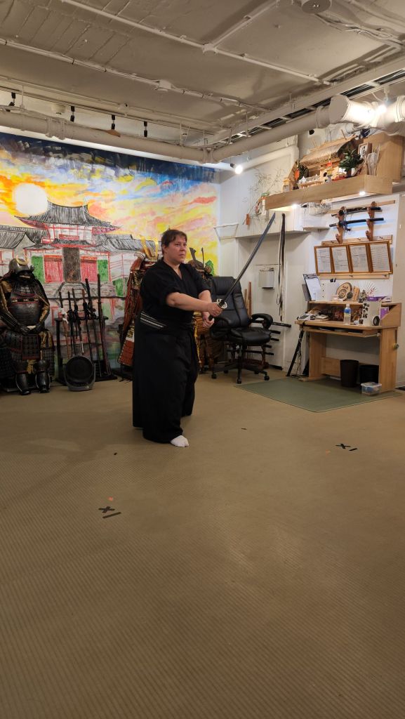First of all, we wouldn’t be sheathing and unsheathing it ourselves–Yushin Sensei would do that for us. There were so many warnings we had to listen to before we got to use it–some more obvious than others, but as I learned from years of training Disney Cast Members, sometimes people do need to be told things out loud. Do not touch the blade. Do not swing so hard that you wind up facing backwards. If the blade gets stuck, do not try to unstick it yourself. Do not let go of the blade.