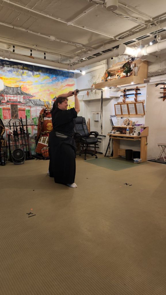 When we received our training swords, we learned a simple kata–a series of choreographed movements. Unsheath, step into the ‘eye-catching stance’, step back to dodge, raise your weapon, strike, swipe the blade down to send anything that might have, uh, coagulated on it flying off, and then sheath in again. Once we mastered that, Yushin Sensei taught us a slightly longer version that involved a blocking move.